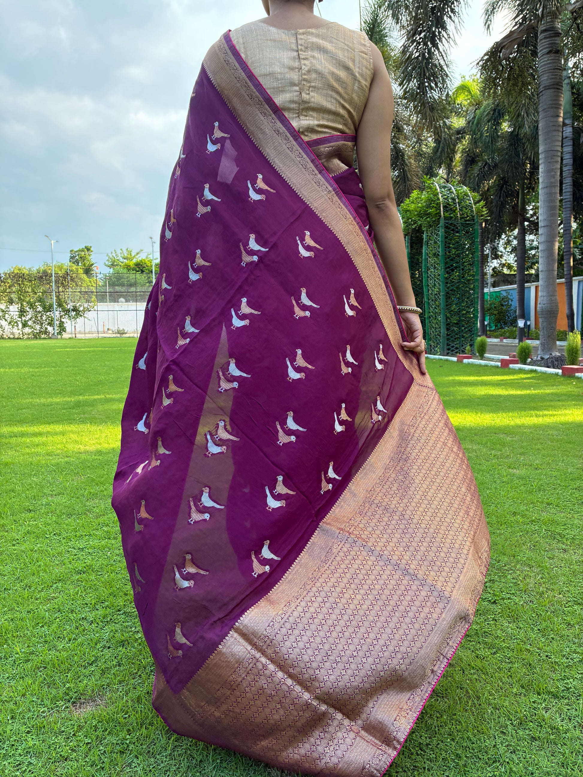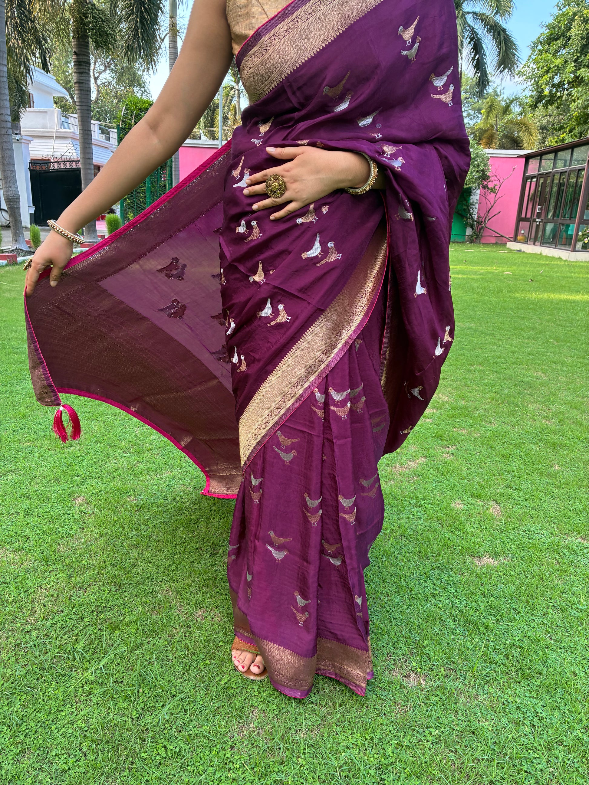 The Purple Bird Dola Silk Saree combines luxurious silk texture with exquisite bird motifs, embodying elegance and artistry. Its rich purple shade adds depth and sophistication, making it an ideal choice for celebrations. Crafted with precision, this saree offers a graceful drape and a timeless appeal that highlights refined craftsmanship and cultural heritage.