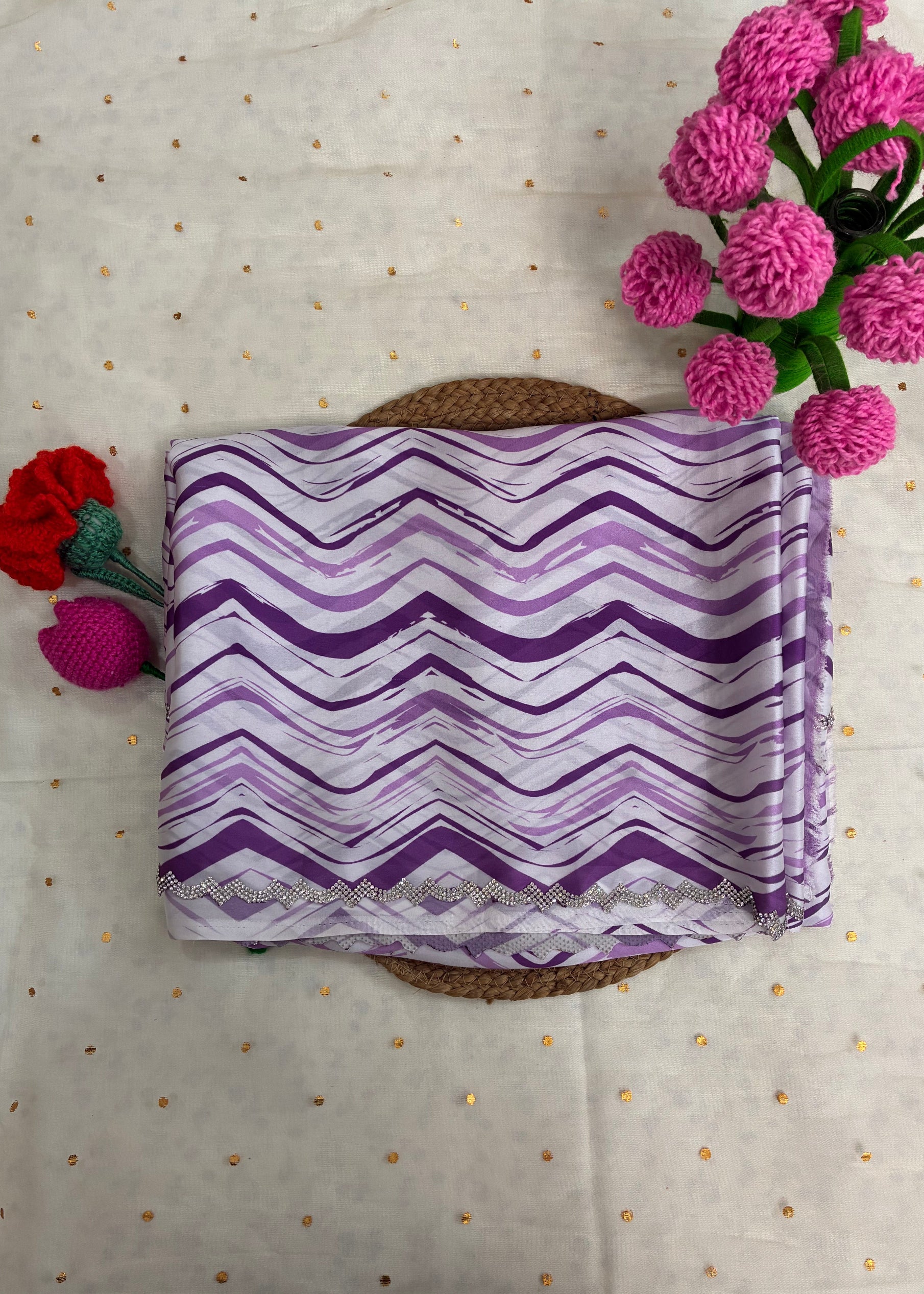Experience elegance with the Purple White Zig-Zag Pastel Crepe Satin Saree. Crafted from smooth crepe satin, this saree features a striking zig-zag pattern in monochrome tones, balanced by a subtle pastel palette. Its lightweight fabric drapes effortlessly, ensuring both comfort and grace for formal occasions or festive celebrations. The sophisticated design makes it a versatile choice for those seeking timeless style with a modern touch.